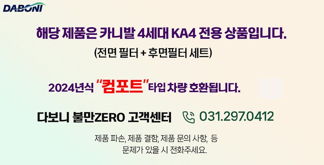 | 품명 및 모델명 | 다보니 PM0.3 블루 활성탄 4세대 카니발 KA4 전면 후면 필터 | 동일모델 출시년월 | 업체미제공 |
