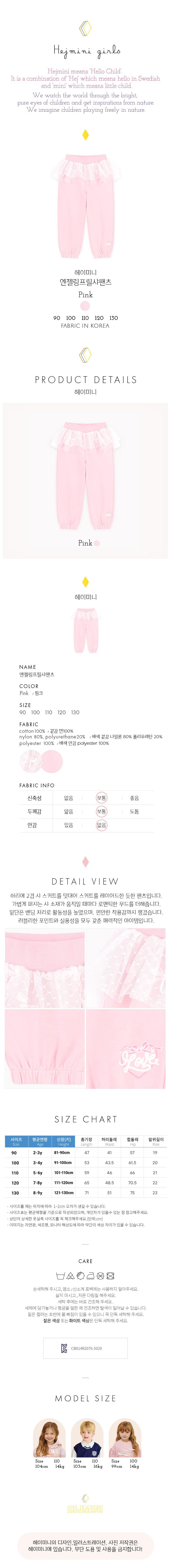 | 품명 및 모델명 | 헤이미니 엔젤링프릴샤팬츠 핑크 100 | KC 인증정보 | CB014R2076-5029 |