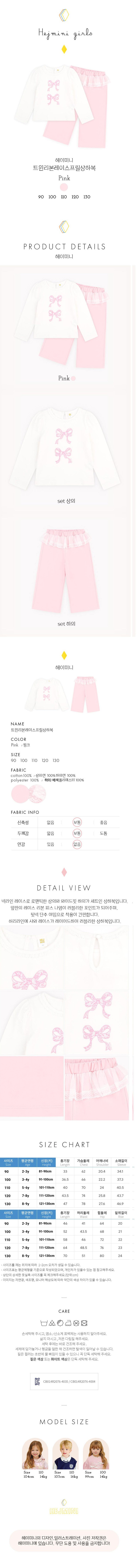 | 품명 및 모델명 | 헤이미니 트윈리본레이스프릴상하복 핑크 100 | KC 인증정보 | 상의: CB014R2076-4035, 하의: CB014R2076-4004 |