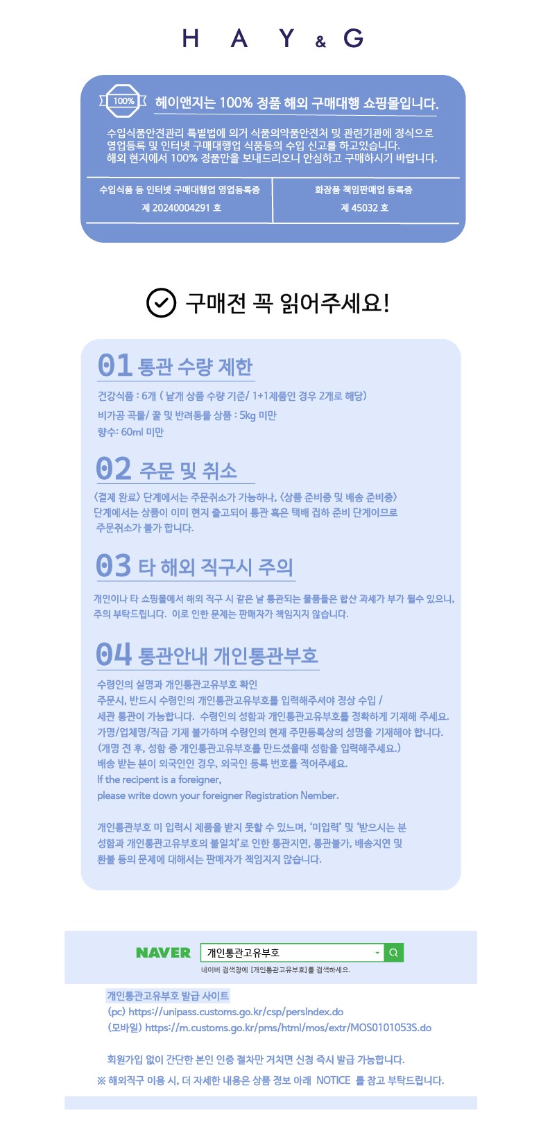 - 법규 개정에 따라 개인통관고유부호 검증 절차가 강화되었습니다.