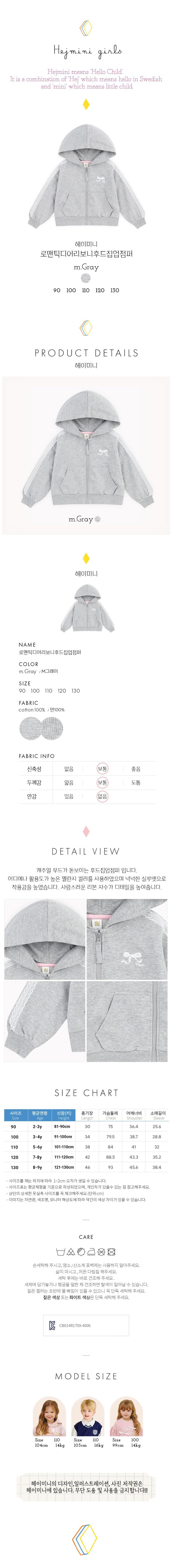 | 품명 및 모델명 | 헤이미니 로맨틱디어리보니후드집업점퍼 M그레이 100 | KC 인증정보 | CB014R1759-4006 |