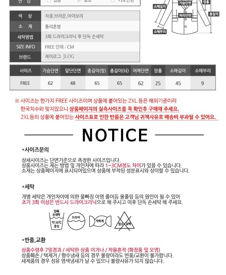 - ㆍ모니터 해상도의 차이로 인해 색상이나 이미지가 실제와 달라, 고객이 단순 변심으로 교환/반품을 무료로 요청하는 경우