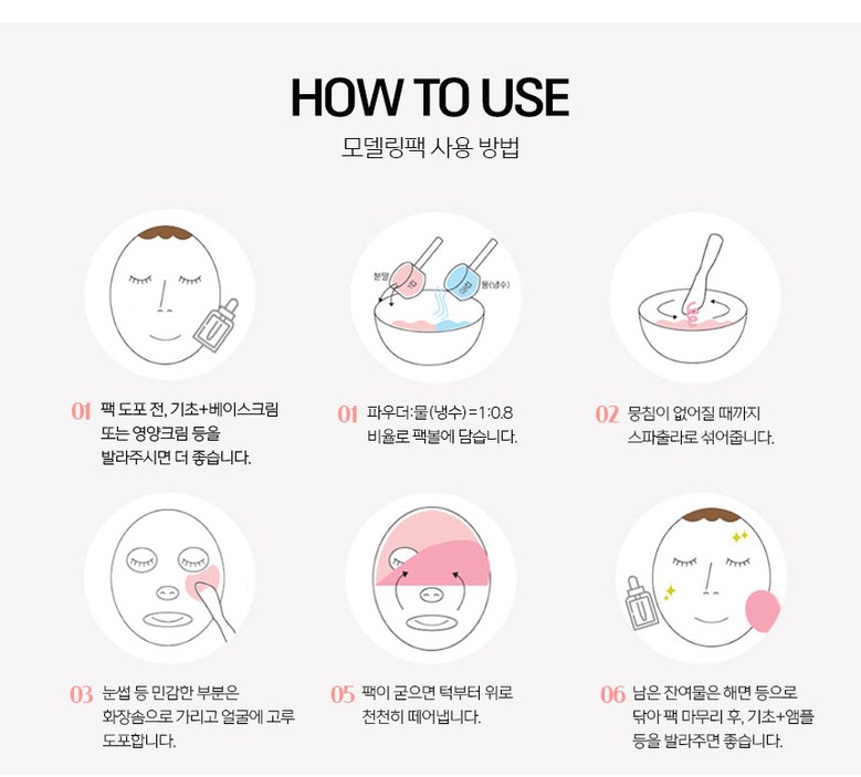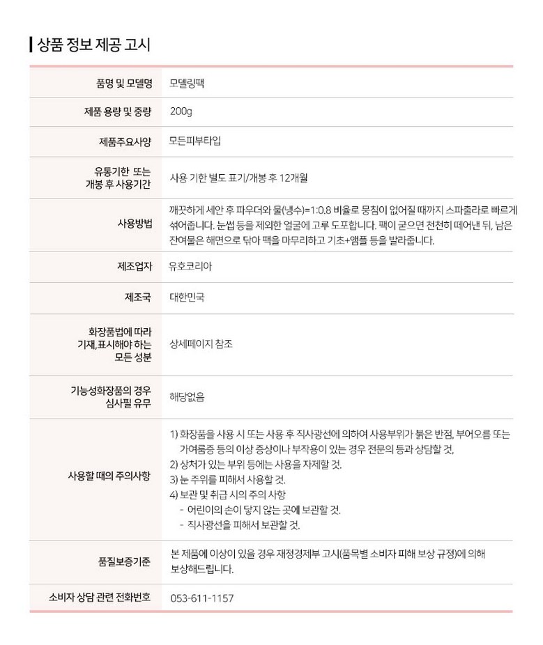 | 사용기한 또는 개봉 후 사용기간 | 사용 기한 별도 표기/개봉 후 12개월 | 사용방법 | 깨끗하게 세안 후 파우더와 물(냉수)=1:0.8 비율로 뭉침이 없어질 때까지 스파출라로 빠르게 섞어줍니다. 눈썹 등을 제외한 얼굴에 고루 도포합니다. 팩이 굳으면 천천히 떼어낸 뒤, 남은잔여물은 해면으로 닦아 팩을 마무리하고 기초+앰플 등을 발라줍니다. |