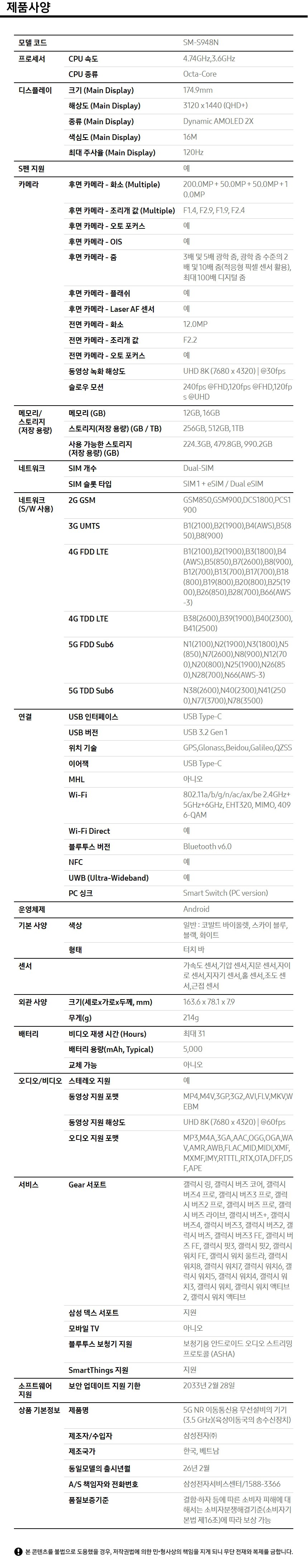 | 품명 및 모델명 | 삼성전자 갤럭시 S26 Ultra 자급제, 화이트, 1TB / SM-S948N | KC 인증정보 | 유/KC마크,추후 업데이트 예정 |