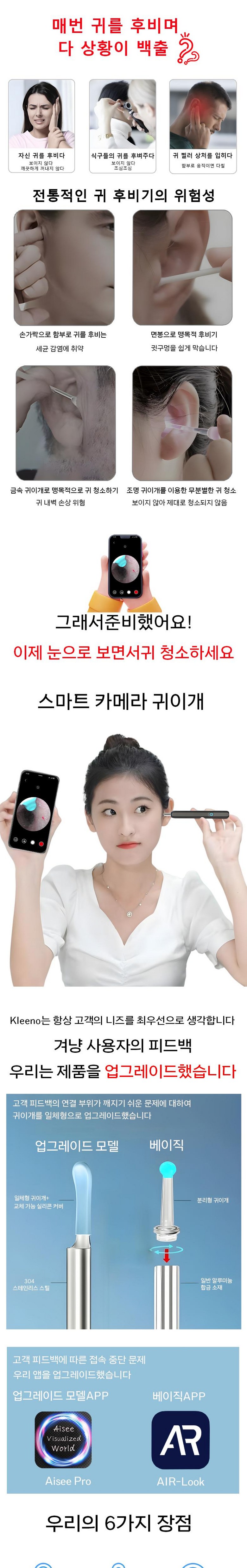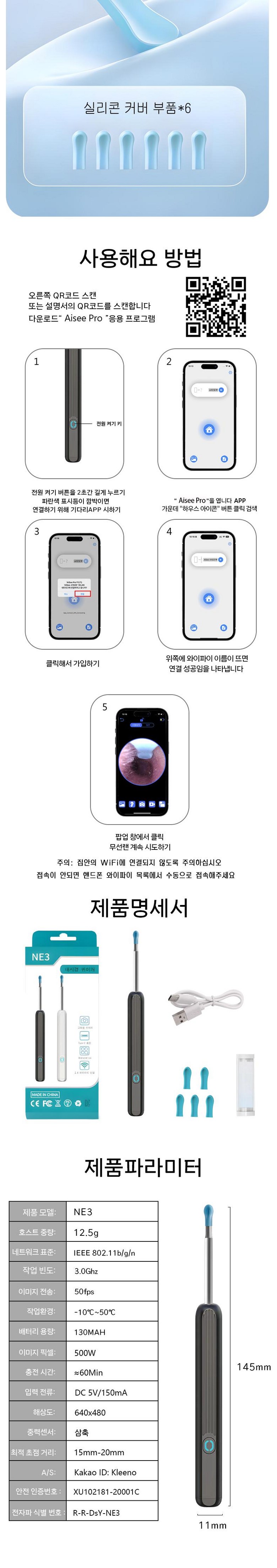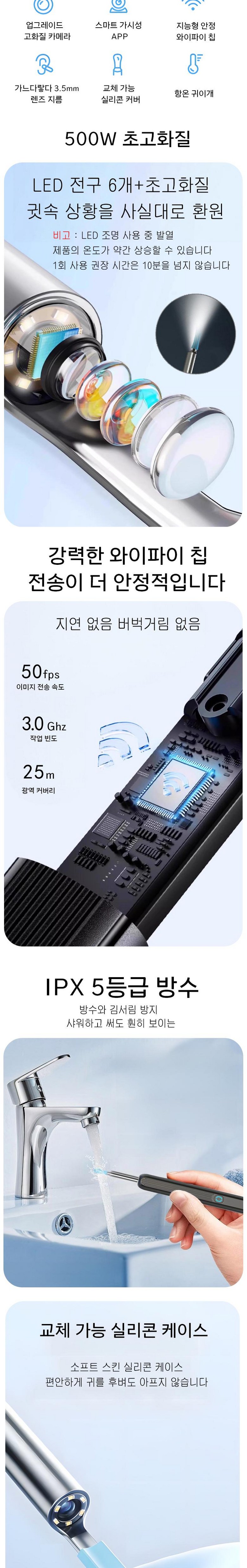 MountainWter 스마트폰 LED 내시경 귀이개 귀후비개 500W고화질카메라귀이개 LED 조명 소프트헤드 Type-C충전