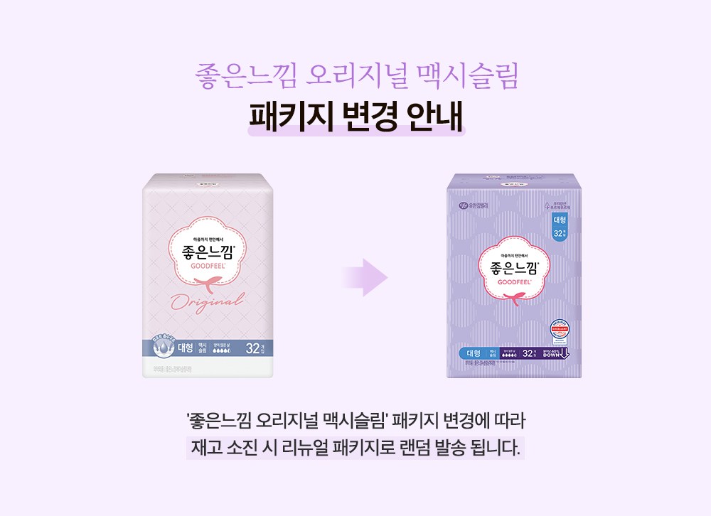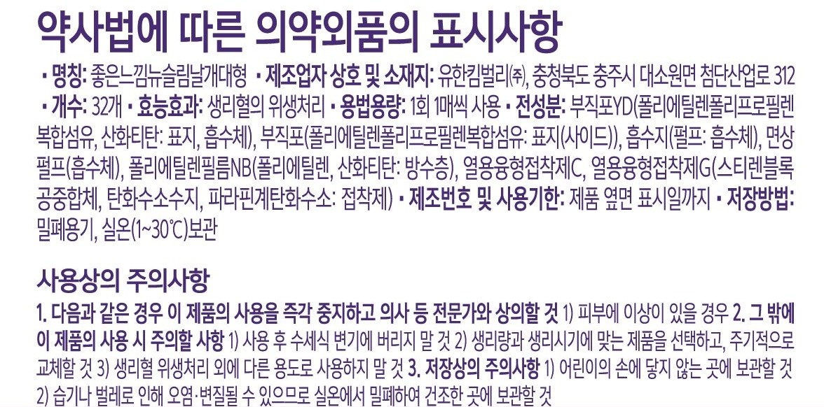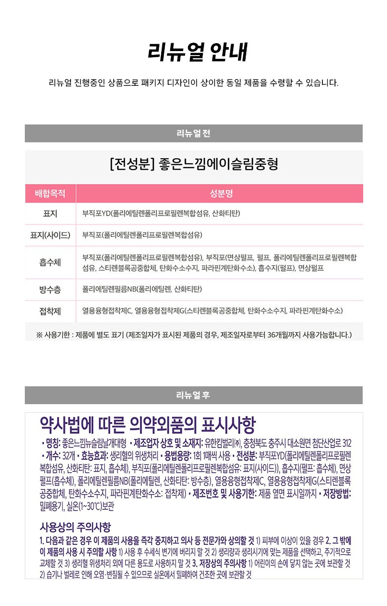 | 품명 및 모델명 | 리뉴얼전 : 좋은느낌에이슬림대형 , 리뉴얼후 : 좋은느낌뉴슬림날개대형 | 인증/허가 사항 | 의약외품 |