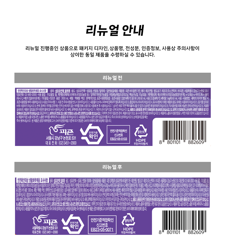 | 품목 및 제품명 | 섬유유연제,탈취제 / 리뉴얼전: 피죤 바이올렛가든_에이, 리뉴얼후: 피죤 강력탈취 섬유유연제 바이올렛 가든 | 용도(표백제의 경우 계열을 함께표시) 및 제형 | 섬유유연제 -섬유용,신발용 / 탈취제 - 일반용(물체용)/ 액체형 |