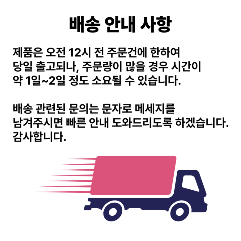| 배송기간 | ㆍ도서산간 지역 등은 배송에 3-5일이 더 소요될 수 있습니다. - 천재지변, 물량 수급 변동 등 예외적인 사유 발생 시, 다소 지연될 수 있는 점 양해 부탁드립니다. | ||
