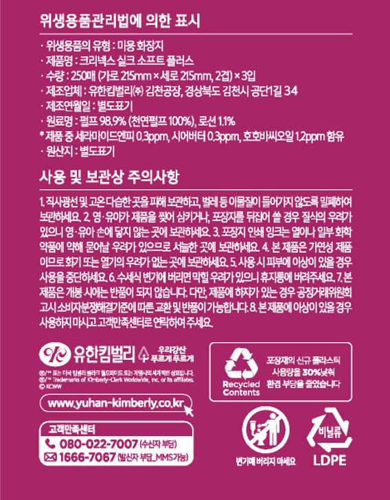 | 품명 및 모델명 | 크리넥스 실크 소프트 플러스 | 인증/허가 사항 | 위생용품 |
