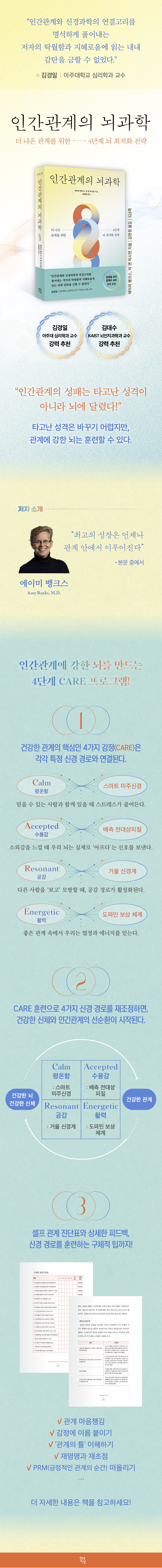 저자는 이 네 가지 감정의 앞 글자를 따서, 과학적 근거를 바탕으로 무너진 관계의 뇌 회로를 다시 훈련하는, 이른바 ‘CARE 프로그램’을 제시한다. 우리는 이 간단한 훈련만으로도 뇌를 재설계함으로 써 더 건강한 인간관계를 맺을 수 있다. 인간관계에 지쳤거나, 더 건강한 삶을 위해 관계의 전환점 을 찾고 있다면, 당신에게 이 책은 가장 실용적이고 설득력 있는 해법이 될 것이다.