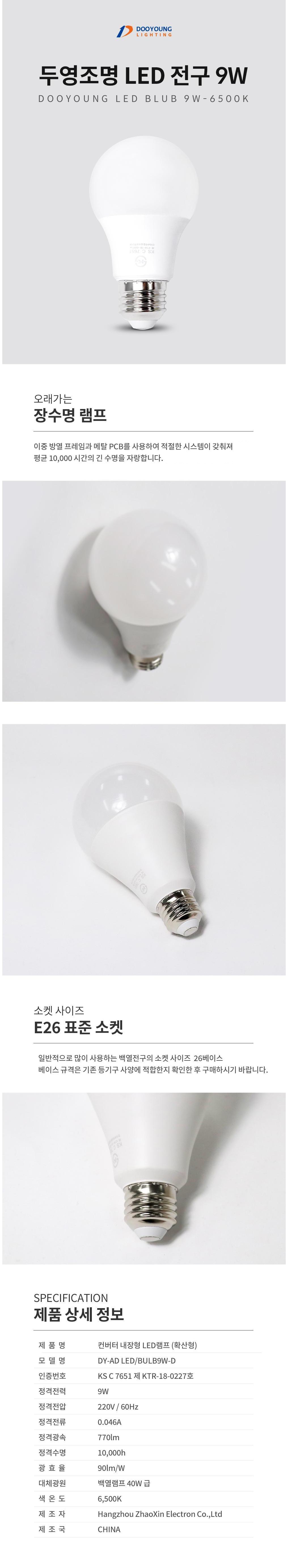 | 품명 및 모델명 | 컨버터 내장형 LED램프 (확산형) / DY-AD LED/BLUB9W-D | KC 인증정보 | KS C 7651 제 KTR-18-0227호 / R-R-D04-LEDADBULB11WD |
