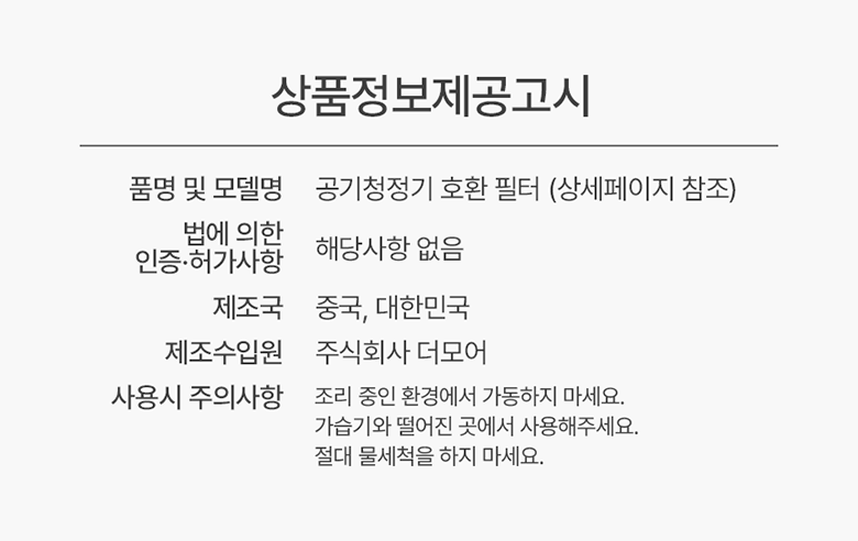 | 품명 및 모델명 | [호환] 삼성 공기청정기 큐브 호환 필터 | 인증/허가 사항 | 해당사항없음 |