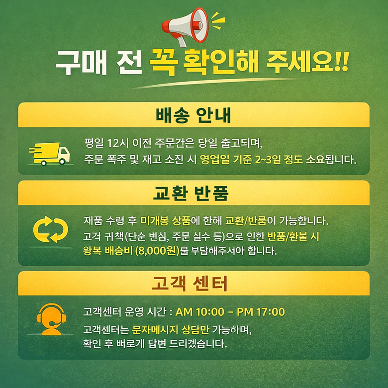| 교환/반품 비용 (왕복비용) | 8,000원 - 단, 고객 변심의 경우에만 발생 - 도서산간 지역 배송불가 |
