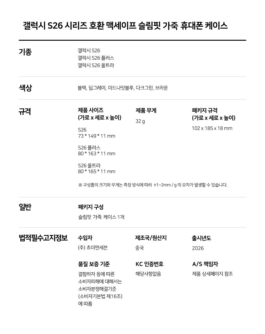 | 품명 및 모델명 | 맥세이프 호환 슬림핏 가죽 휴대폰 케이스 | 인증/허가 사항 | 해당없음(14세이상) |