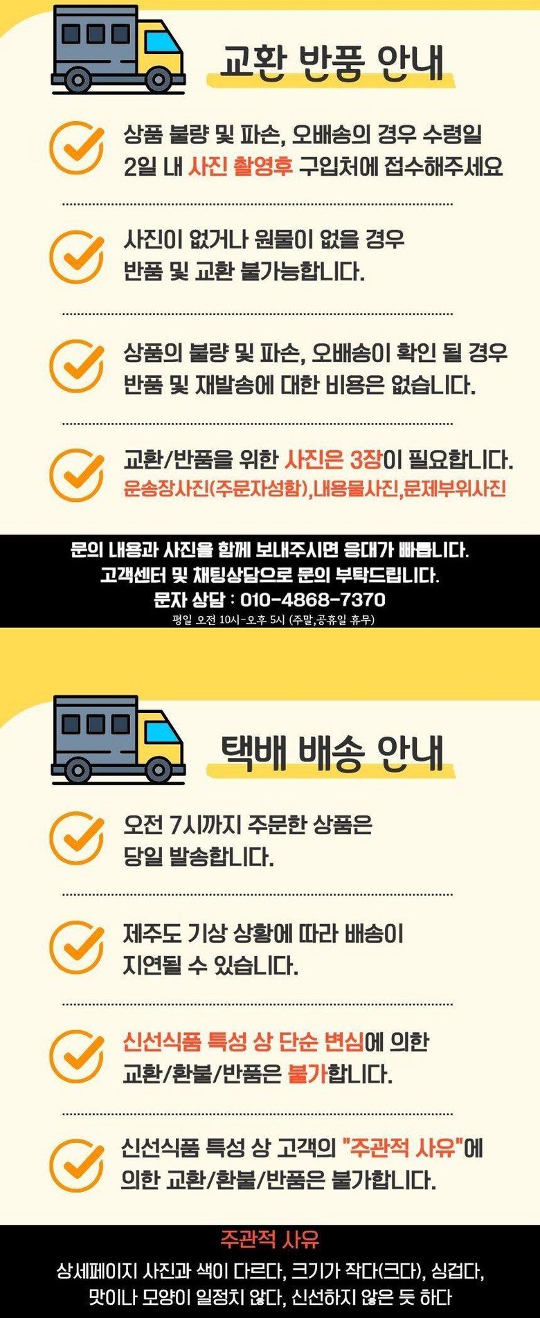 - ㆍ모니터 해상도의 차이로 인해 색상이나 이미지가 실제와 달라, 고객이 단순 변심으로 교환/반품을 무료로 요청하는 경우