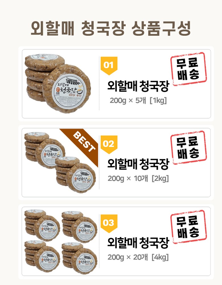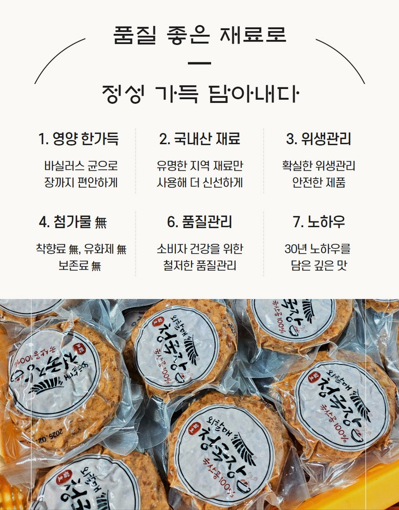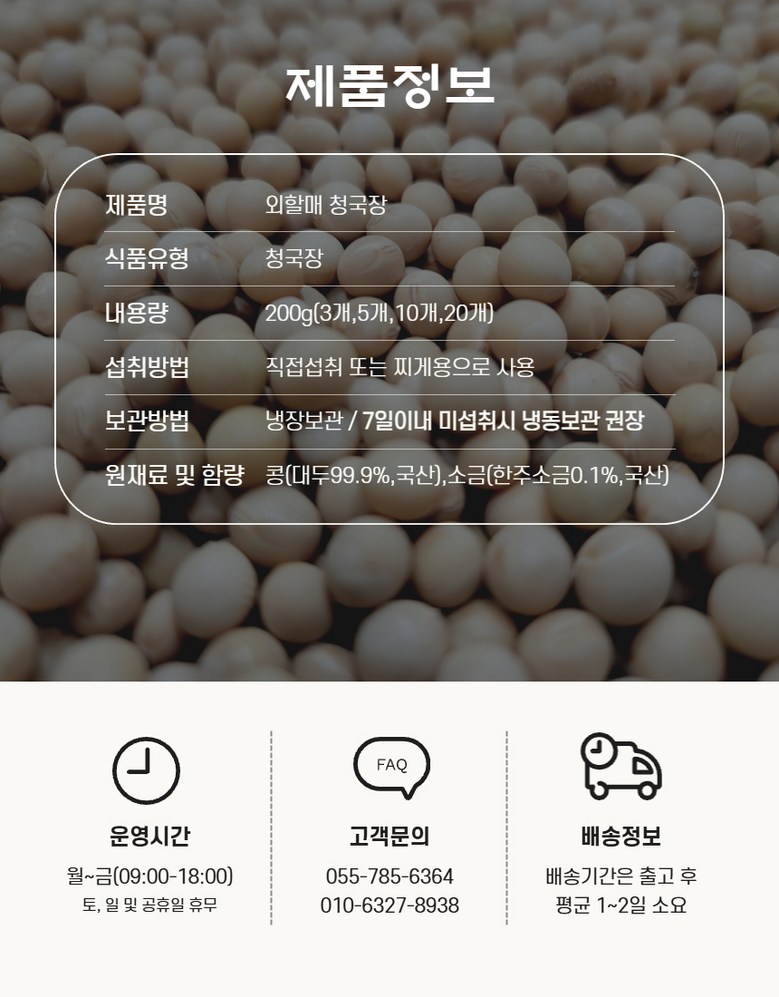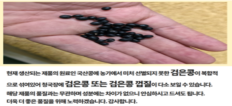 | 포장단위별 내용물의 용량(중량), 수량 | 상품 상세페이지 참조 | 원재료명 및 함량 | 대두99.9%(국산), 한주소금0.1%(국산) |