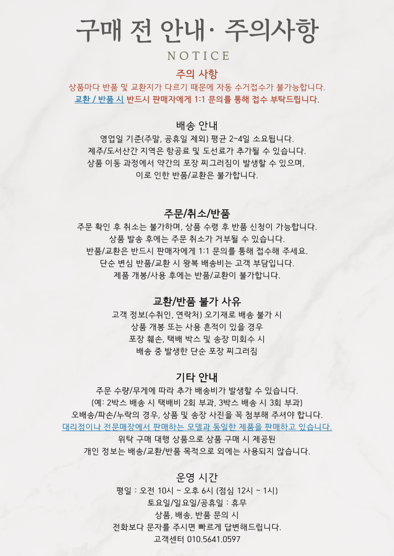 - ㆍ교환/반품에 관한 일반적인 사항은 판매자가 제시사항보다 관계법령이 우선합니다.