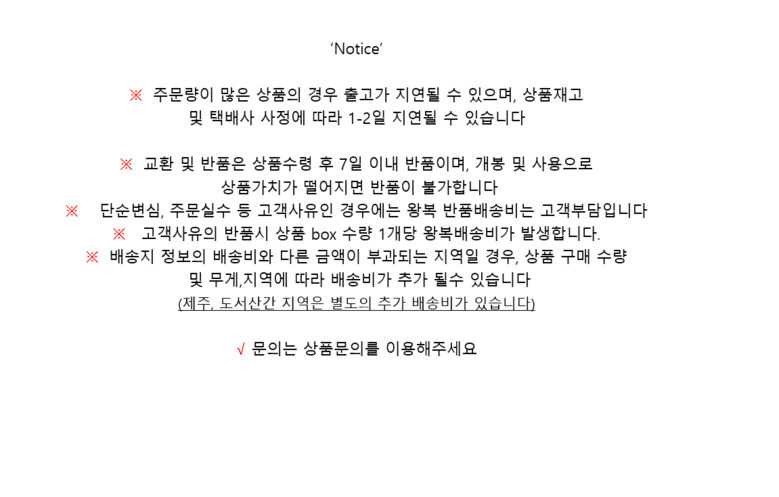 - ㆍ모니터 해상도의 차이로 인해 색상이나 이미지가 실제와 달라, 고객이 단순 변심으로 교환/반품을 무료로 요청하는 경우