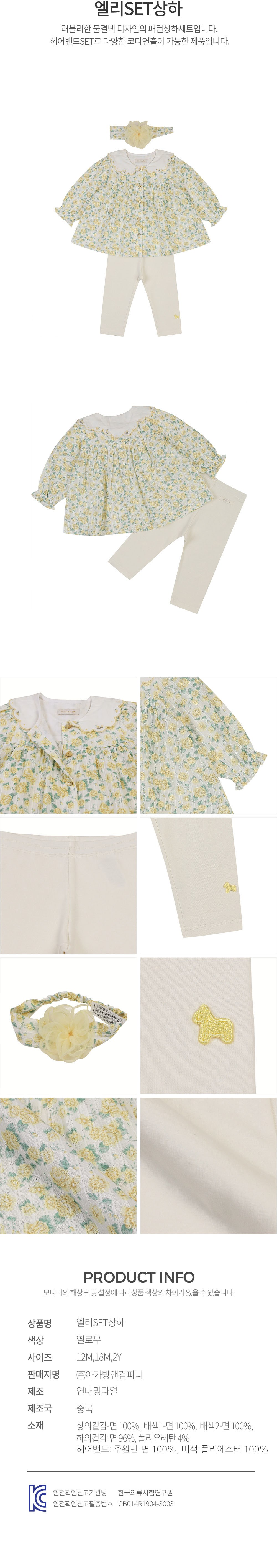 | 품명 및 모델명 | 에뜨와 선물용 엘리SET상하 YELLOW 12M | KC 인증정보 | CB014R1904-3003 |