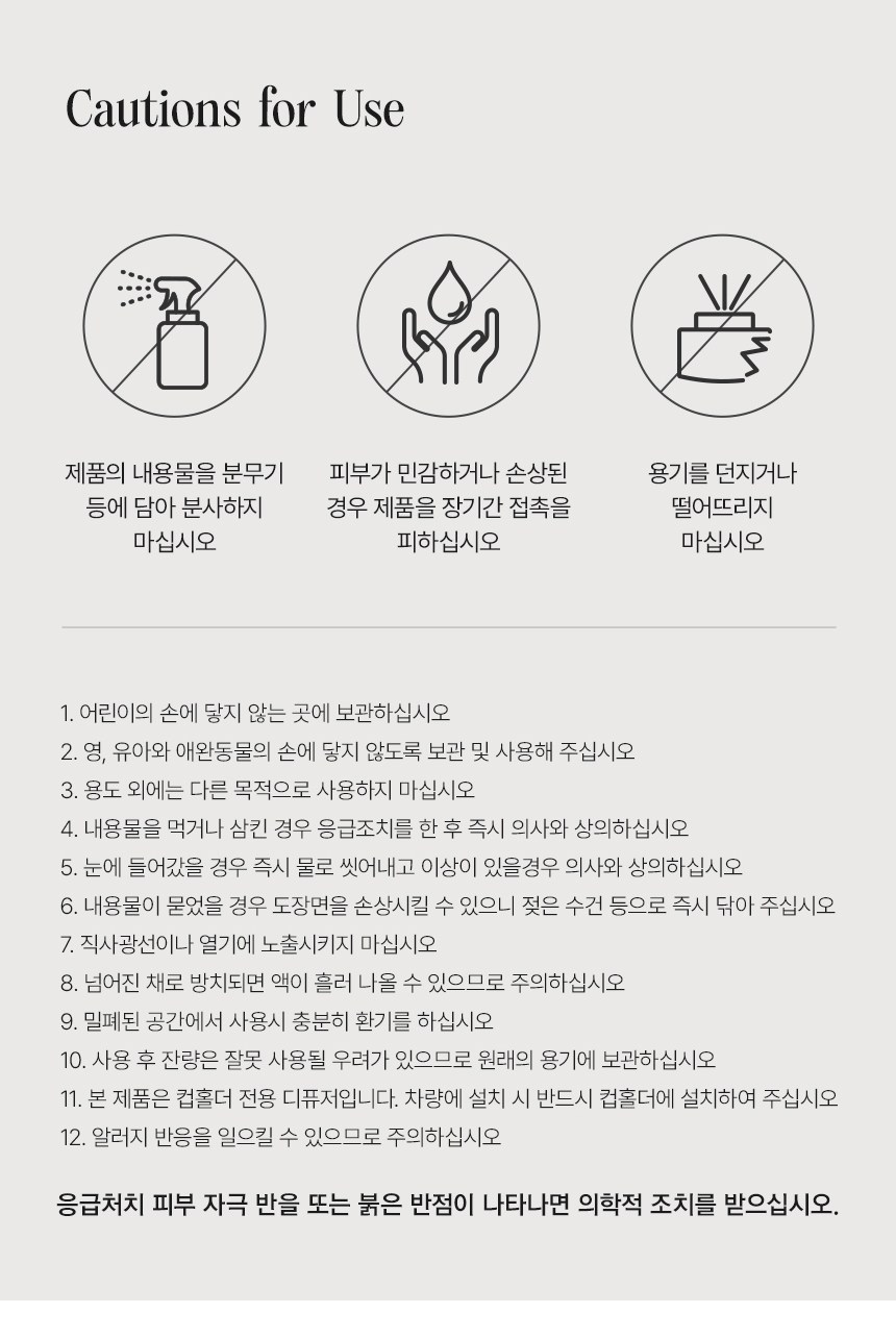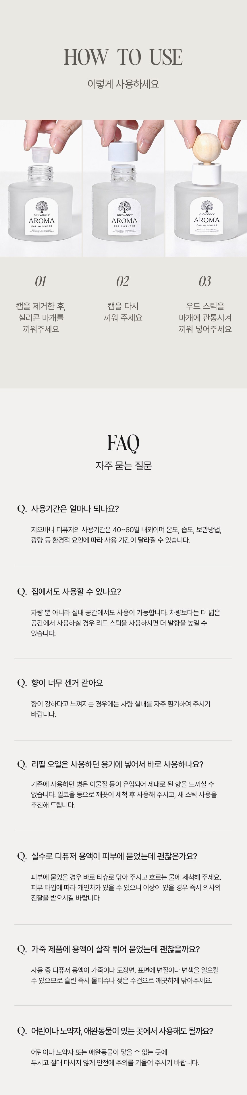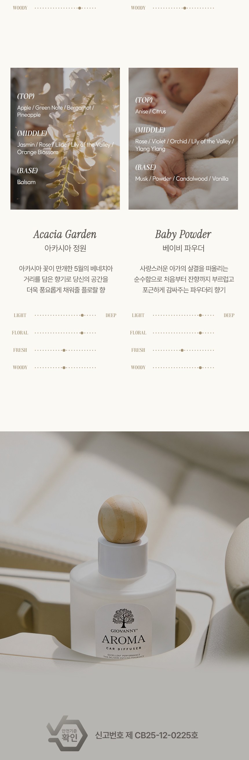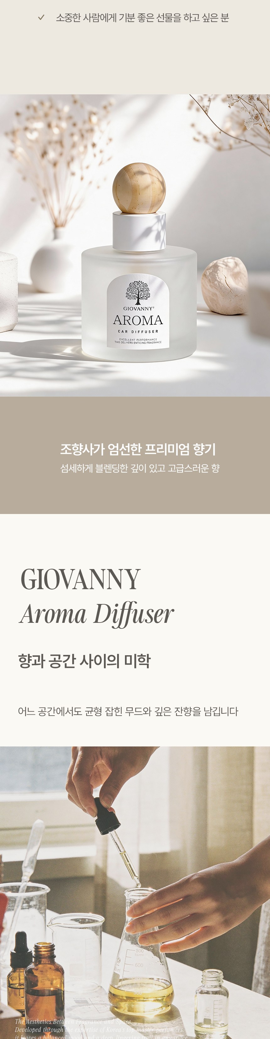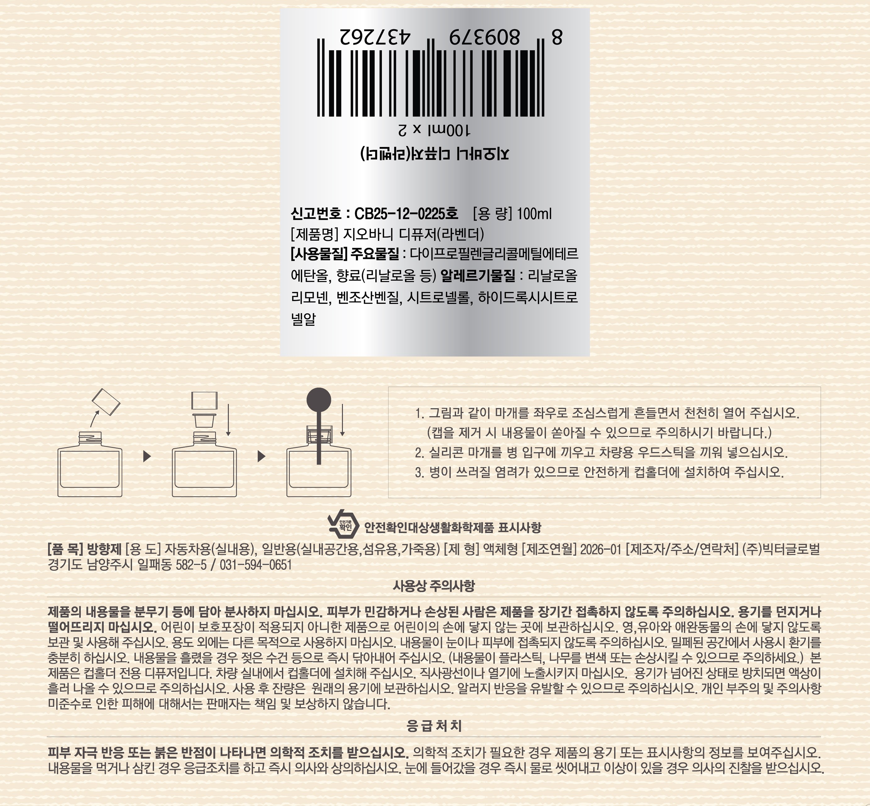 | 품목 및 제품명 | 방향제/지오바니 디퓨저(라벤더) | 용도(표백제의 경우 계열을 함께표시) 및 제형 | 자동차용(실내용),일반용(실내공간용,섬유용,가죽용) / 액체형 |