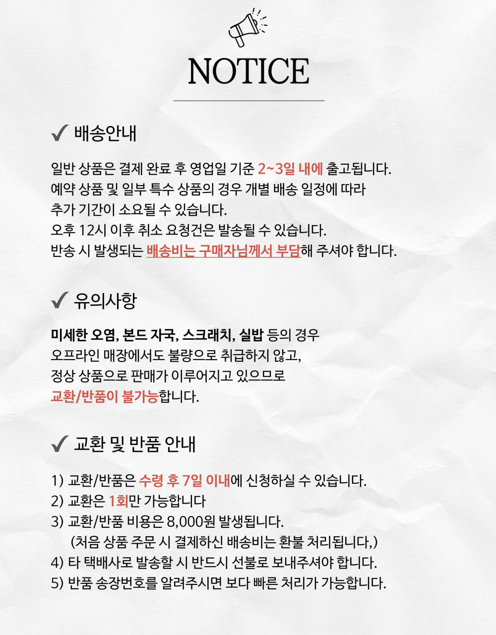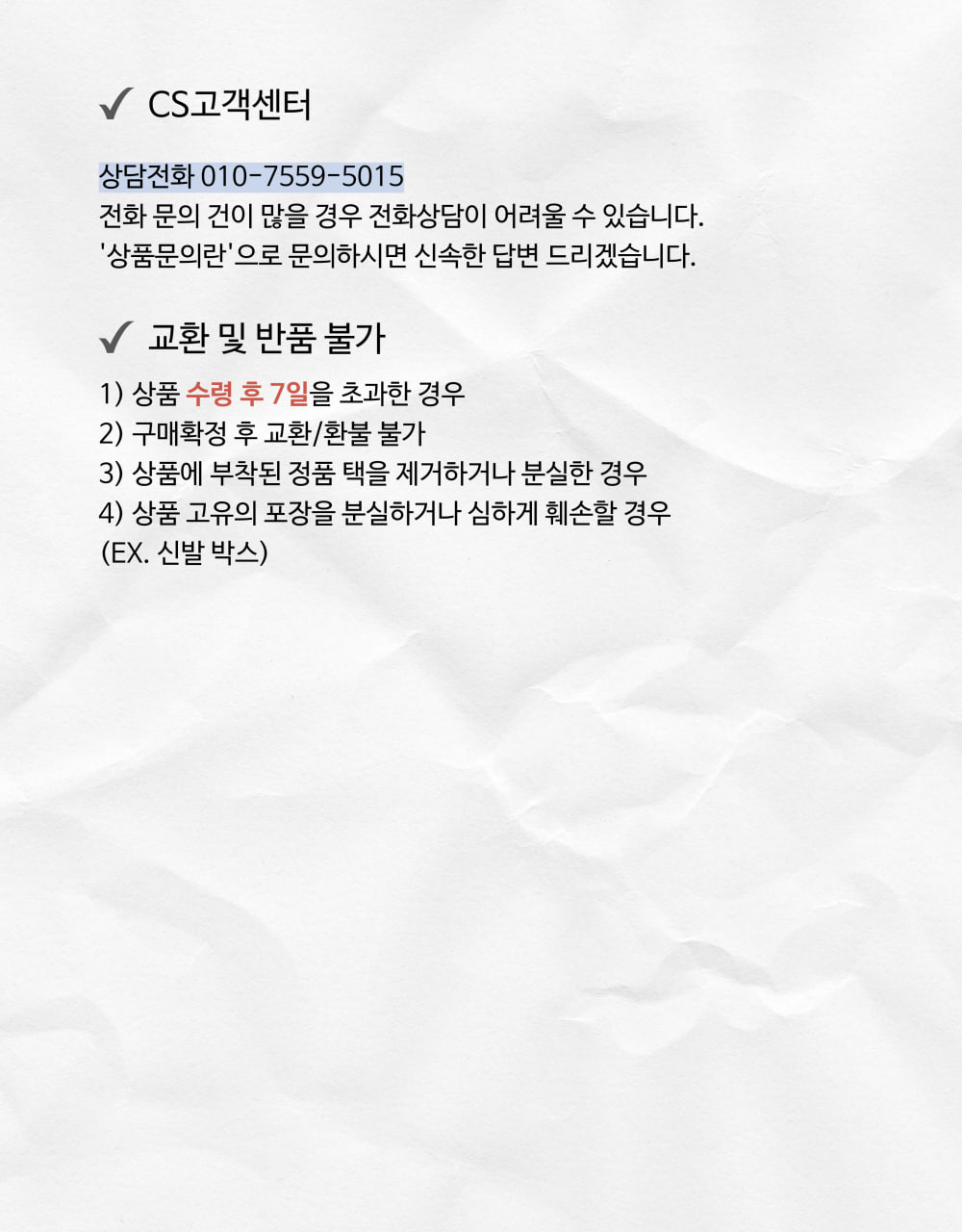 - ㆍ모니터 해상도의 차이로 인해 색상이나 이미지가 실제와 달라, 고객이 단순 변심으로 교환/반품을 무료로 요청하는 경우