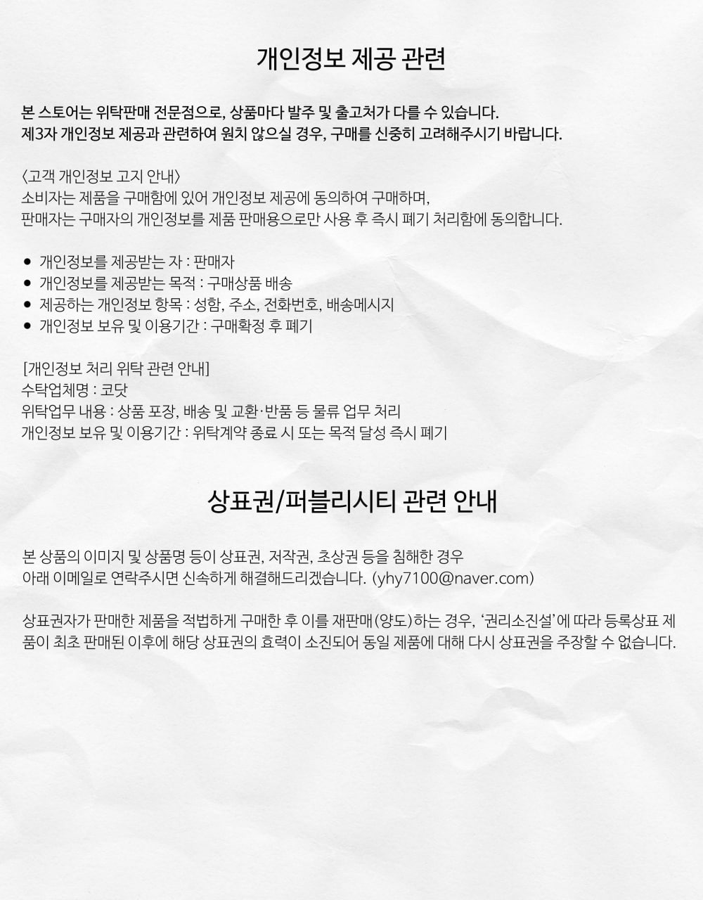- ㆍ교환/반품에 관한 일반적인 사항은 판매자가 제시사항보다 관계법령이 우선합니다.