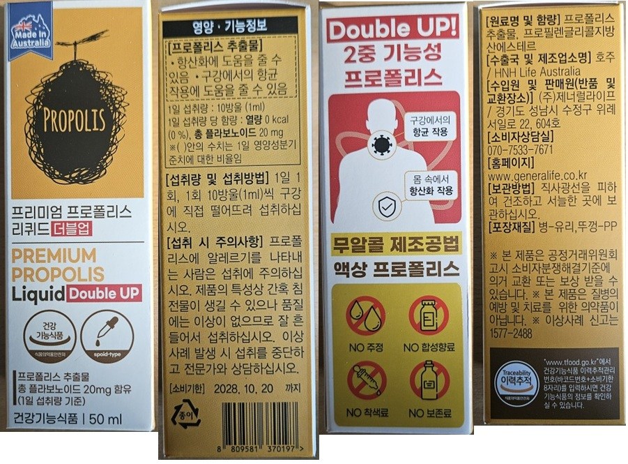 | 제품명 | 프리미엄 프로폴리스 리퀴드 알콜프리 | 제조업소의 명칭과 소재지 | 컨텐츠참조 |