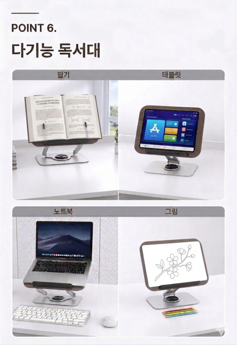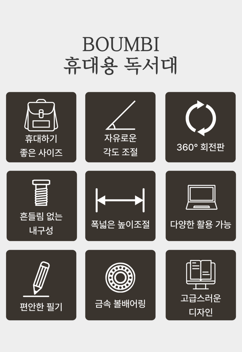 | 품명 및 모델명 | BOUMBI 360도 무소음 회전 노트북 거치대 높이각도 조절 휴대용 독서대 | 인증/허가 사항 | 상품 상세페이지 참조 |
