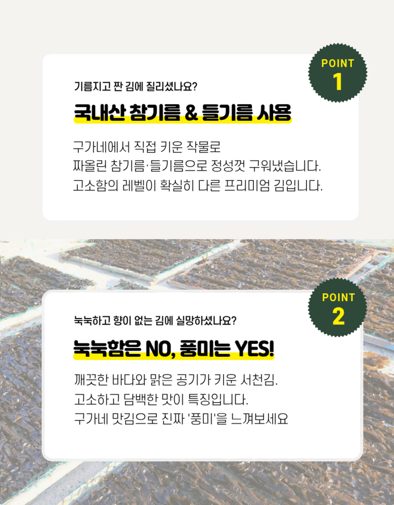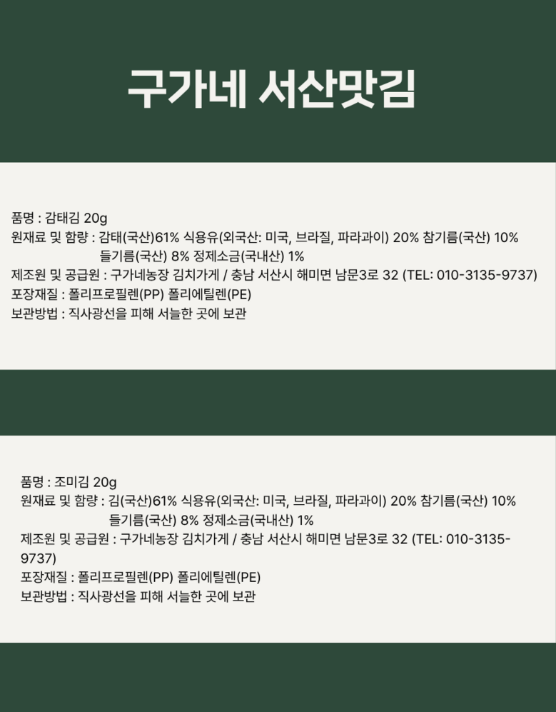 | 품목 또는 명칭 | 구가네 서산맛김 | 포장단위별 내용물의 용량(중량),수량,크기 | 20g |