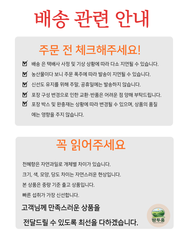 | 배송방법 | 신선/냉장/냉동 | 배송비 | 무료배송 - 도서산간 지역 배송불가 |