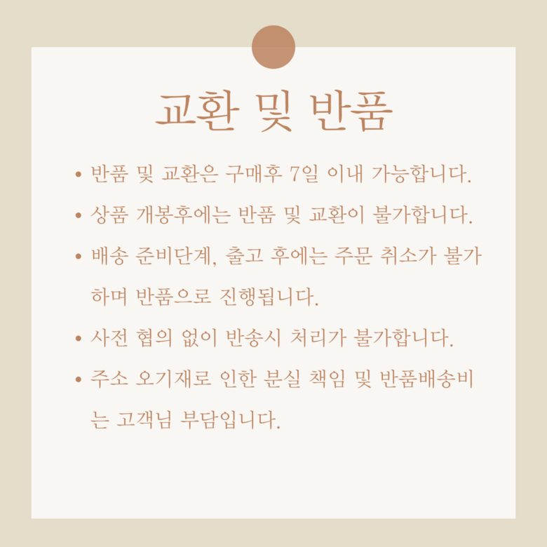 - ㆍ모니터 해상도의 차이로 인해 색상이나 이미지가 실제와 달라, 고객이 단순 변심으로 교환/반품을 무료로 요청하는 경우