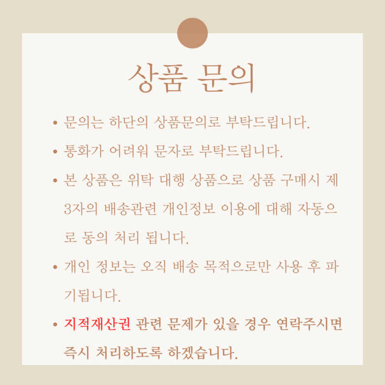 - 상품문의 및 후기게시판을 통해 취소나 환불, 반품 등은 처리되지 않습니다.