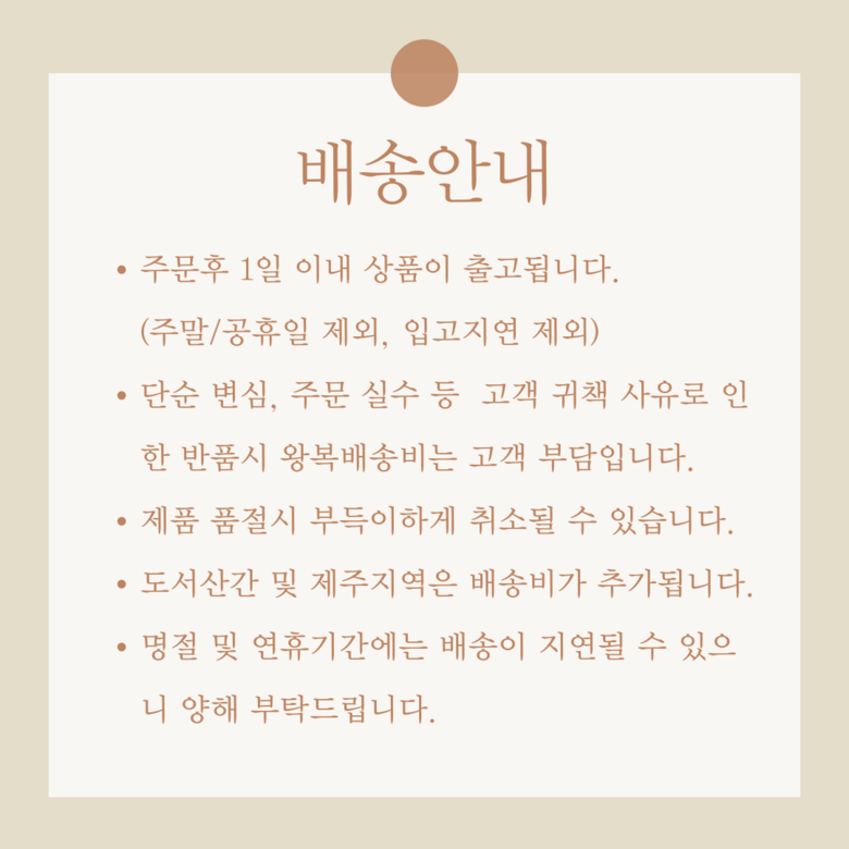 | 배송기간 | ㆍ도서산간 지역 등은 배송에 3-5일이 더 소요될 수 있습니다. - 천재지변, 물량 수급 변동 등 예외적인 사유 발생 시, 다소 지연될 수 있는 점 양해 부탁드립니다. | ||