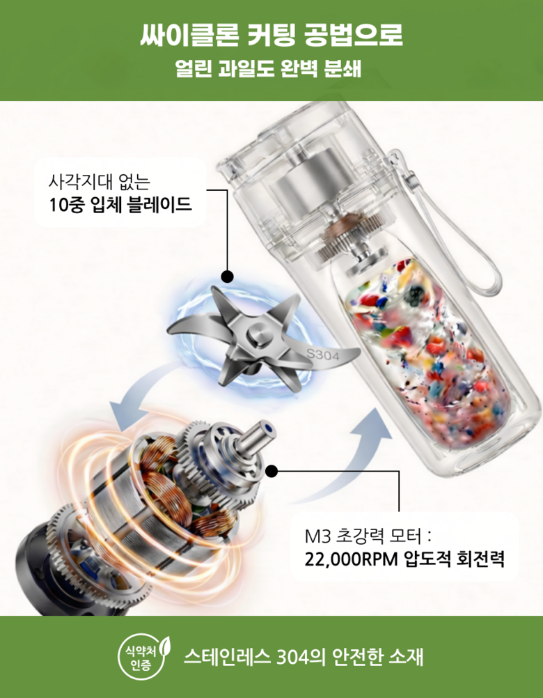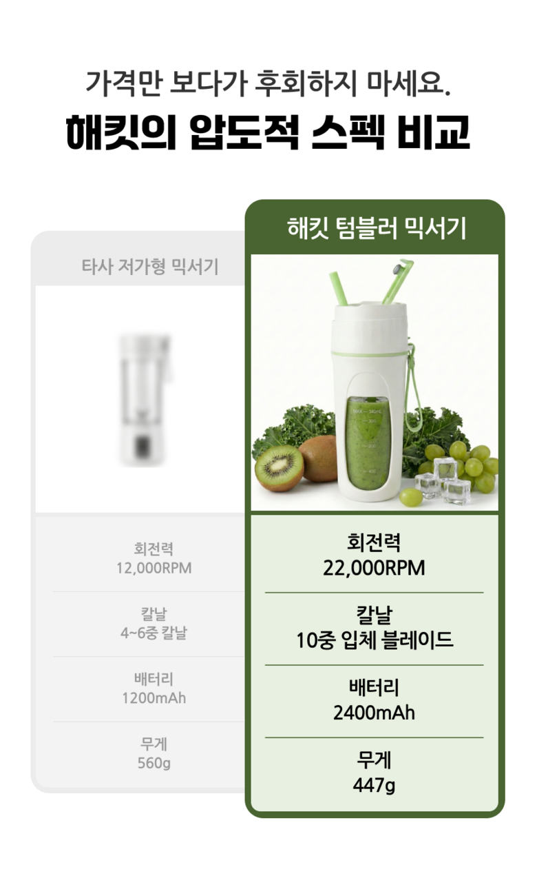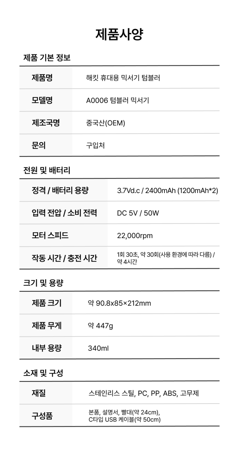 | 품명 및 모델명 | 초강력분쇄 해킷 휴대용 소형 믹서기 텀블러 | 재질 | 스테인레스, PC, PP, ABS, 고무제 |