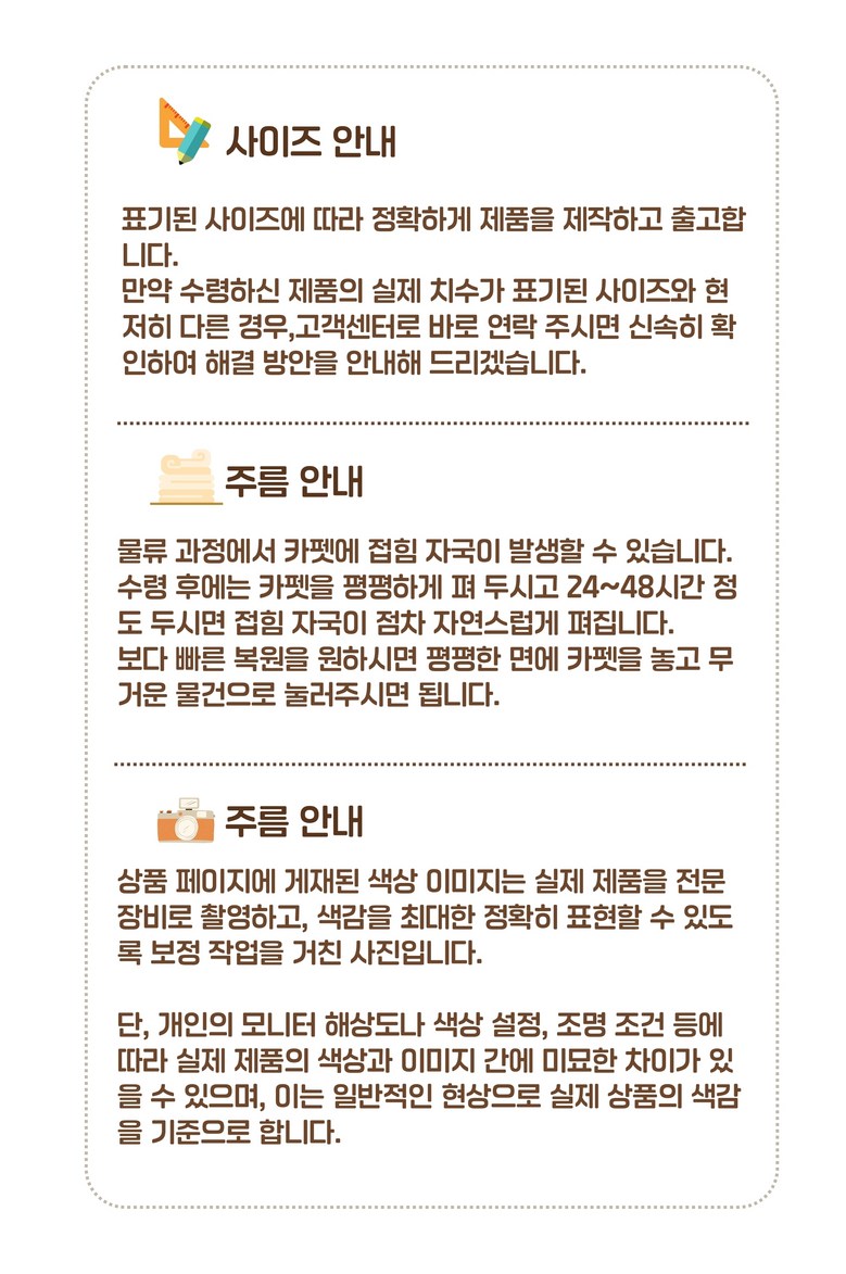 - ㆍ모니터 해상도의 차이로 인해 색상이나 이미지가 실제와 달라, 고객이 단순 변심으로 교환/반품을 무료로 요청하는 경우