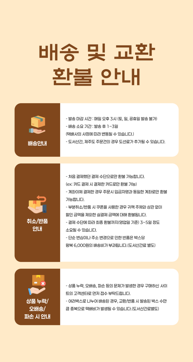 | 교환/반품 비용 (왕복비용) | 6,000원 - 단, 고객 변심의 경우에만 발생 - 도서산간 지역 배송불가 - 부분반품 시, 남은금액이 무료배송 조건을 유지하면 편도 배송비용만 부과 |