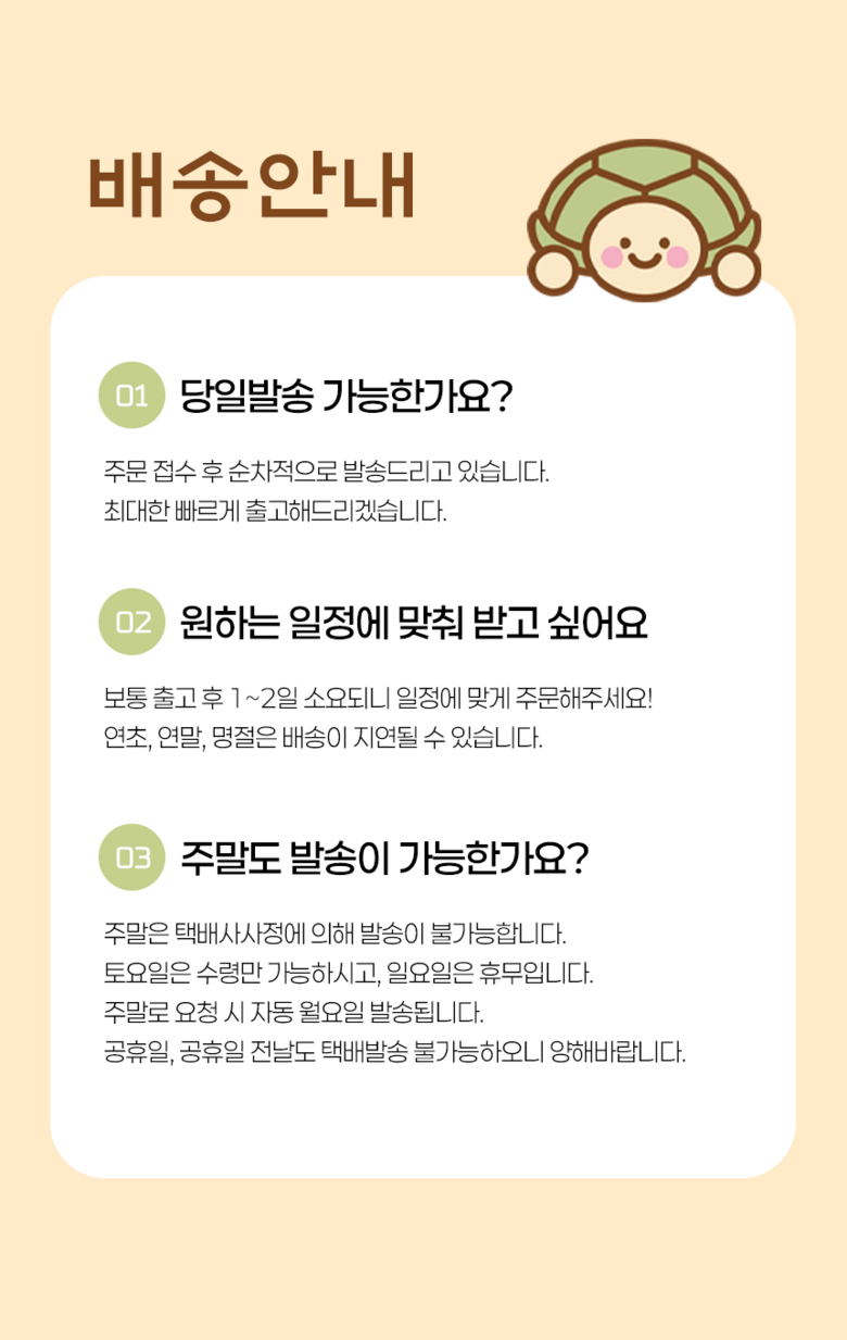 | 배송방법 | 순차배송 | 배송비 | 3,000원 - 30,000원 이상 구매 시 무료배송 - 도서산간 지역 배송불가 |