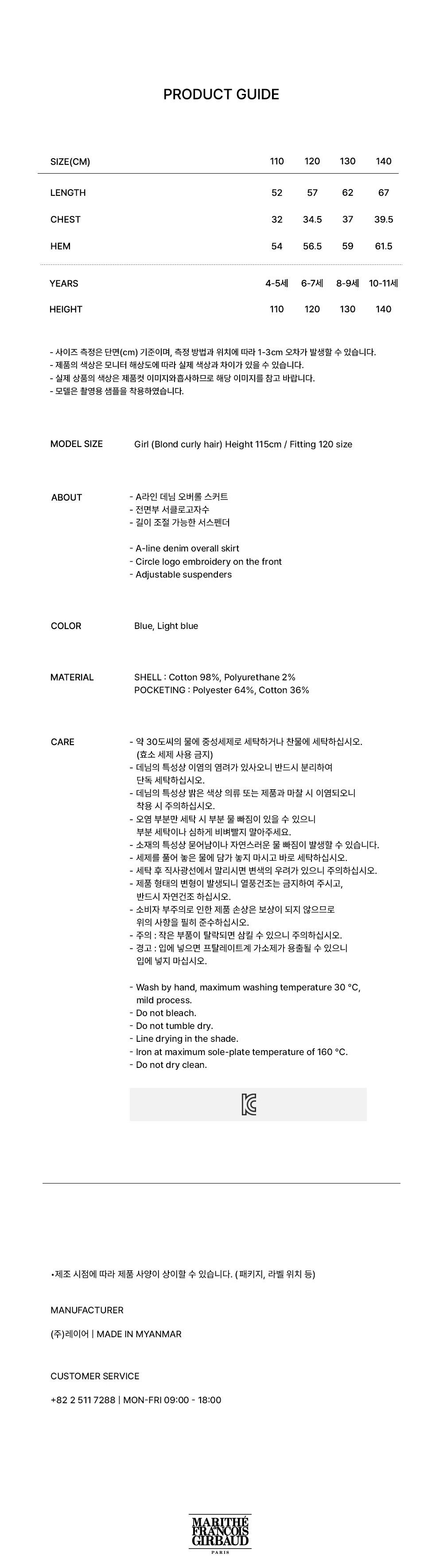마리떼프랑소와저버 아동용 W A라인 데님 오버롤 스커트 MFE46SDS102