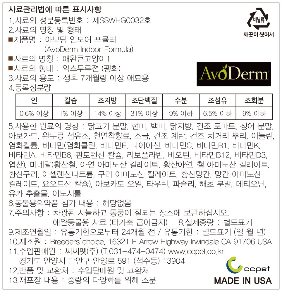 | 품명 및 모델명 | 아보덤 인도어 포뮬러 | 인증/허가 사항 | 사료관리법에 따른 성분등록번호 : 컨텐츠 참조 |