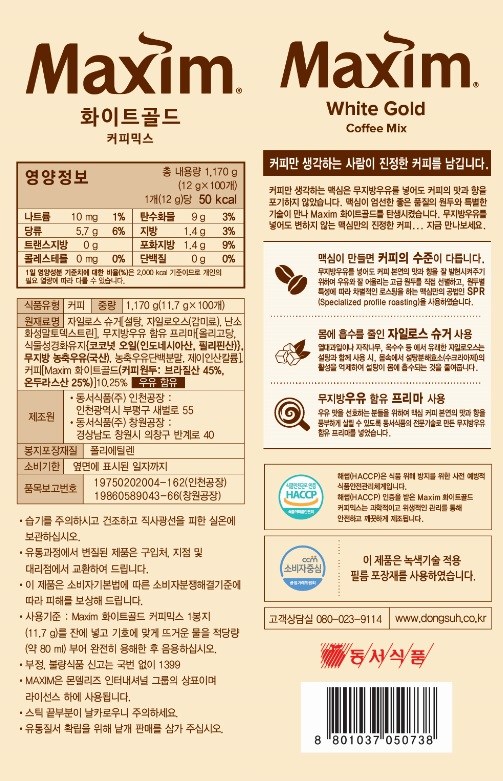 | 제품명 | Maxim 화이트골드 커피믹스 | 식품의 유형 | 컨텐츠 참조 |