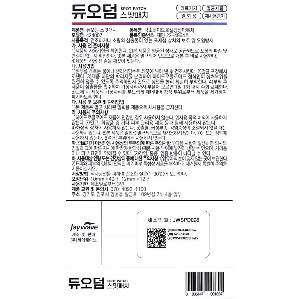 | 품명 및 모델명 | 국소 하이드로겔 창상피복재 / 424007 | 허가∙인증∙신고번호 (의료기기법에 따른 허가∙인증∙신고 대상 의료기기에 한함) | 품목허가번호: 제인 22-4964 호 |