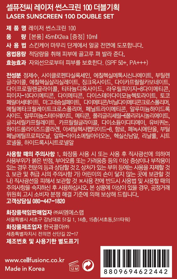| 화장품제조업자, 화장품책임판매업자 및 맞춤형화장품판매업자 | 한국콜마㈜ / ㈜씨엠에스랩 | 제조국 | 대한민국 |