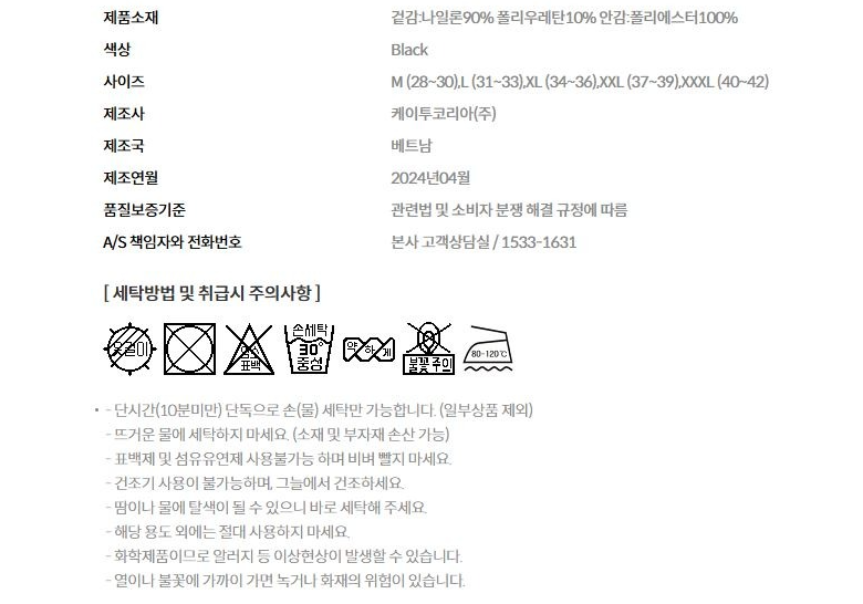 | 제조국 | 상품 상세페이지 참조 | 세탁방법 및 취급시 주의사항 | 상품 상세페이지 참조 |