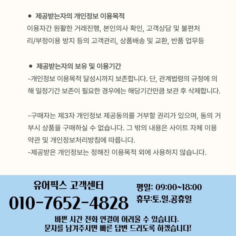 - ㆍ모니터 해상도의 차이로 인해 색상이나 이미지가 실제와 달라, 고객이 단순 변심으로 교환/반품을 무료로 요청하는 경우