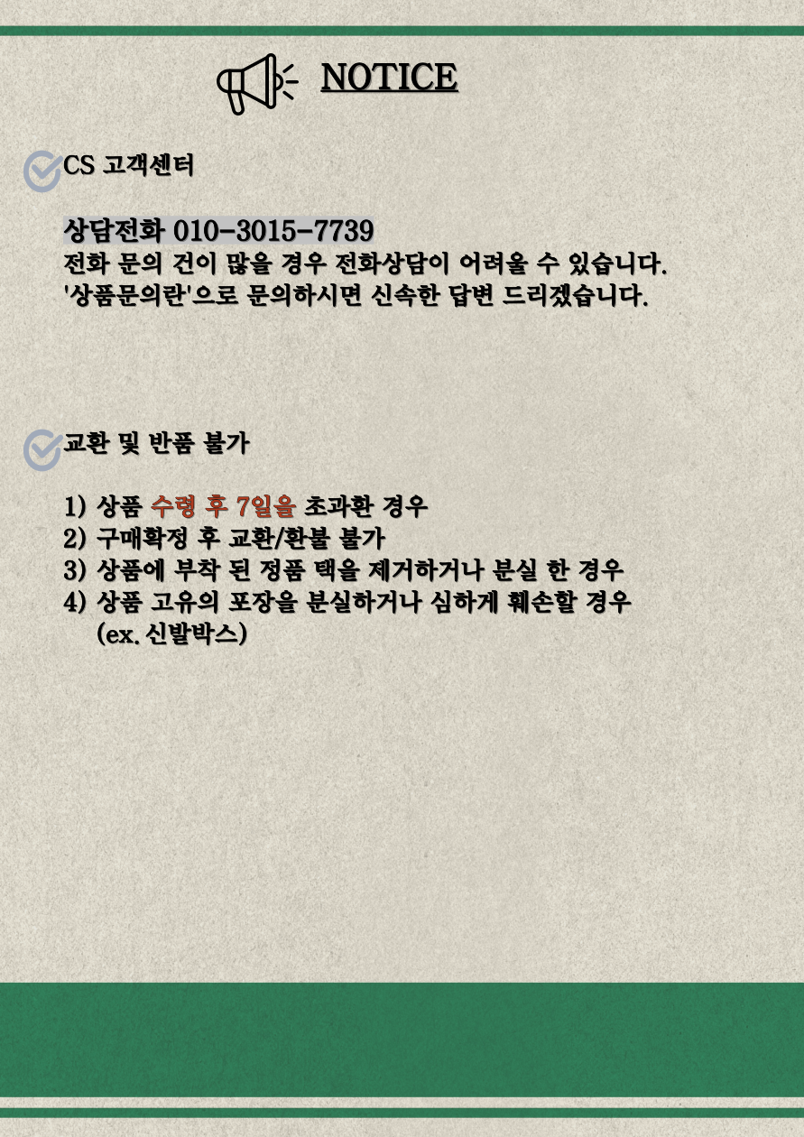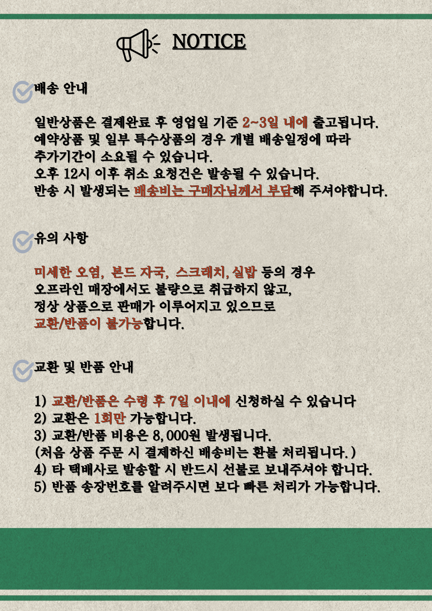 | 교환/반품 신청 기준일 | ㆍ단순변심에 의한 교환/반품은 제품 수령 후 7일 이내까지, 교환/반품 제한사항에 해당하지 않는 경우에만 가능 (배송비용과 교환/반품 비용 왕복배송비 고객부담) ㆍ상품의 내용이 표시·광고의 내용과 다른 경우에는 상품을 수령한 날부터 3개월 이내, 그 사실을 안 날 또는 알 수 있었던 날부터 |