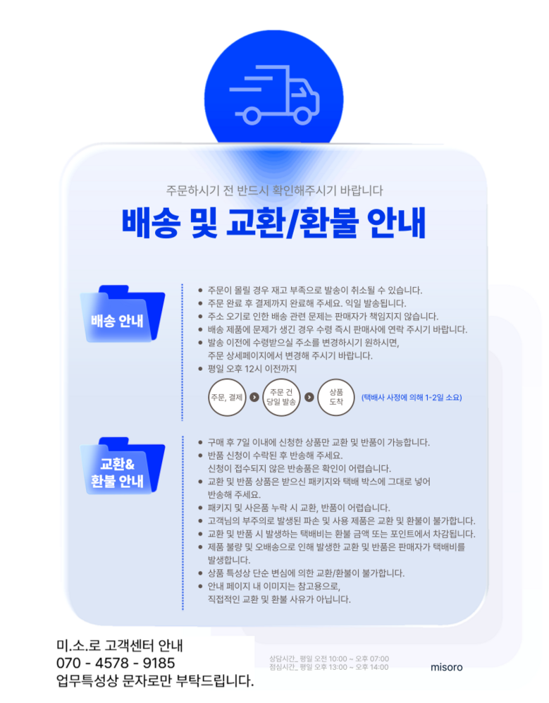 - ㆍ교환/반품에 관한 일반적인 사항은 판매자가 제시사항보다 관계법령이 우선합니다.