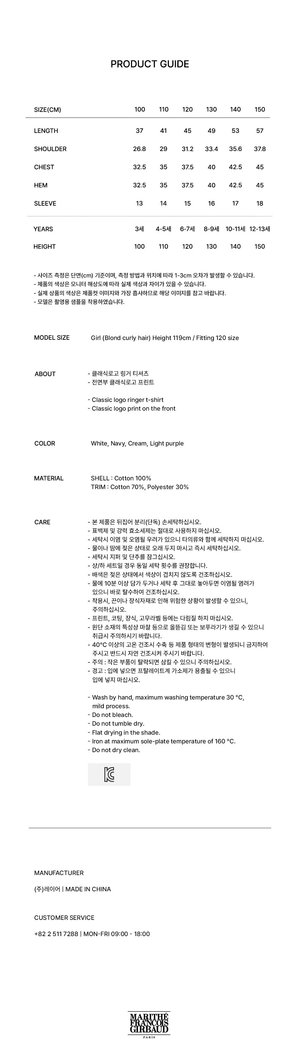 | 품명 및 모델명 | 마리떼키즈 KIDS CLASSIC LOGO RINGER TEE cream 150 | KC 인증정보 | 유/KC마크 |