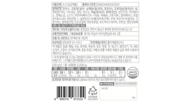 | 제조연월일, 소비기한 또는 품질유지기한 | 상품 상세페이지 참조 | 세부 품목군별 표시사항 | 상품 상세페이지 참조 |
