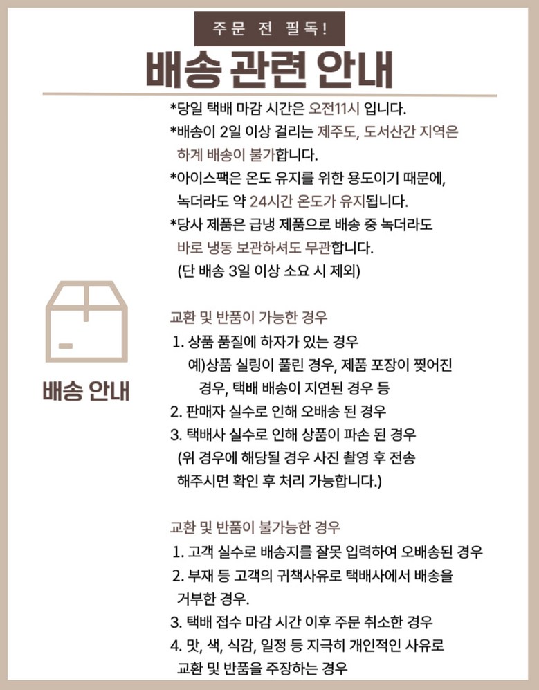 | 배송방법 | 신선/냉장/냉동 | 배송비 | 4,000원 - 50,000원 이상 구매 시 무료배송 · 도서산간 추가 배송비 - 제주 지역: 4,000원 - 도서산간 지역: 4,000원 |