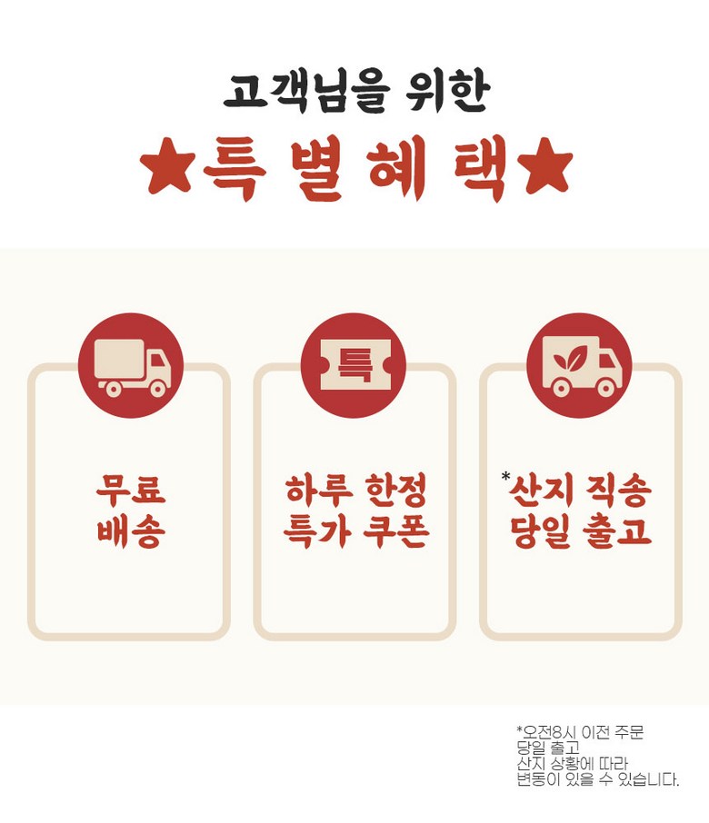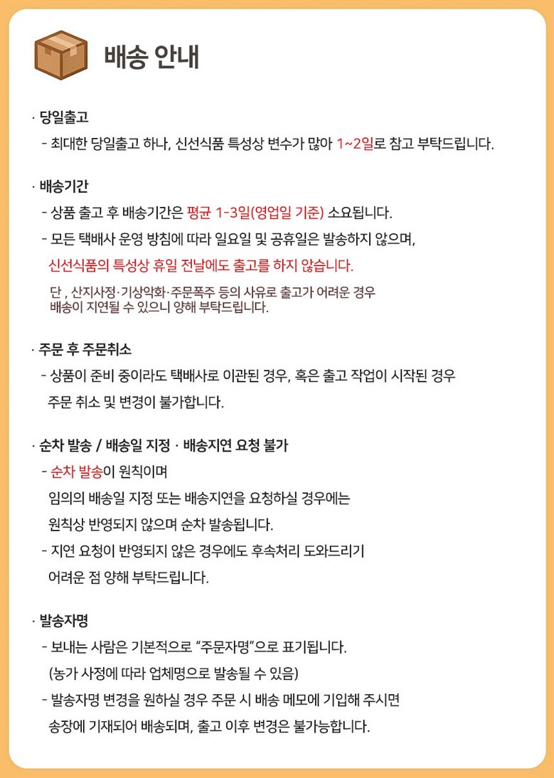 | 배송방법 | 신선/냉장/냉동 | 배송비 | 무료배송 - 도서산간 지역 배송불가 |